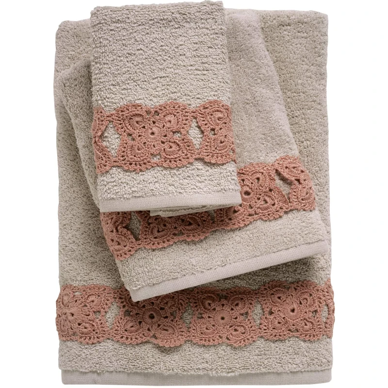 Σετ πετσέτες της σειράς Daily με πλεκτή δαντέλα. Είναι από 100% βαμβάκι υψηλής ποιότητας με βάρος 500gr/m2, ιδιαίτερα απορροφητικές και ανθεκτικές στην χρήση. Τα χρώματα που χρησιμοποιούνται είναι ανεξίτηλα και υποαλλεργικά. Το σετ αποτελείται από μία πετσέτα μπάνιου 70x140εκ., μία πετσέτα προσώπου 50x90εκ. και μία πετσέτα χεριών 30x50εκ. Das home...makes your house a home!