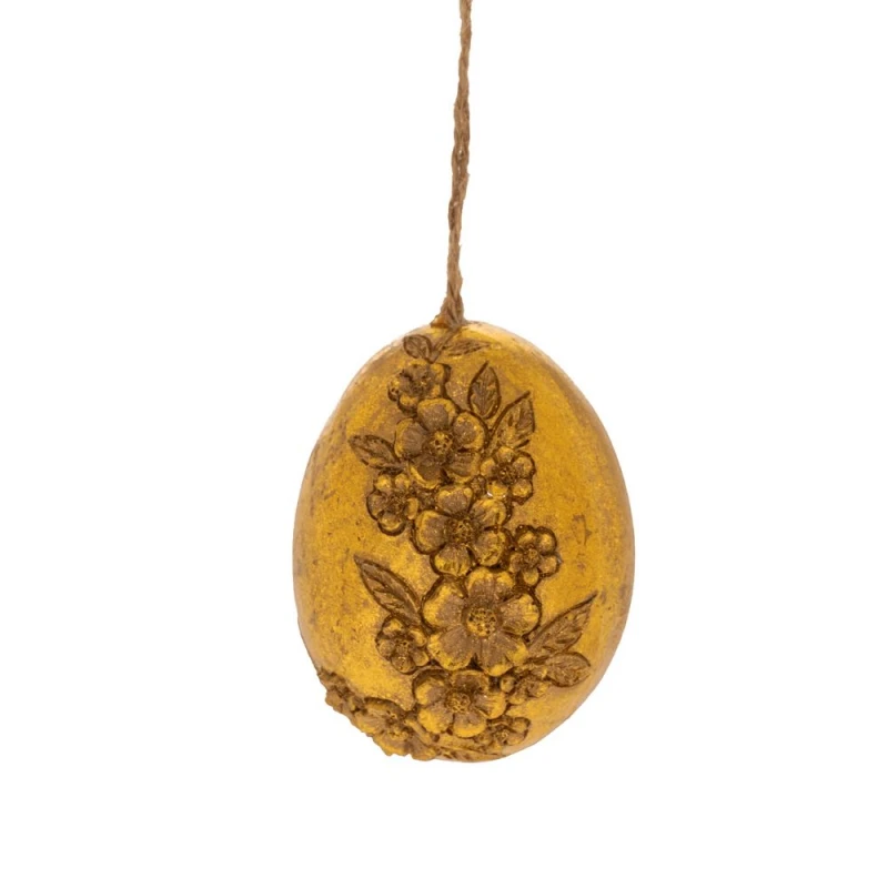 Πασχαλινό διακοσμητικό αυγό κρεμαστό polyresin σε χρυσό χρώμα με σχέδιο από την iliadis - Διαστάσεις: 5x7εκ. Η ελάχιστη ποσότητα αγοράς για αυτό το προιόν είναι 6τμχ.