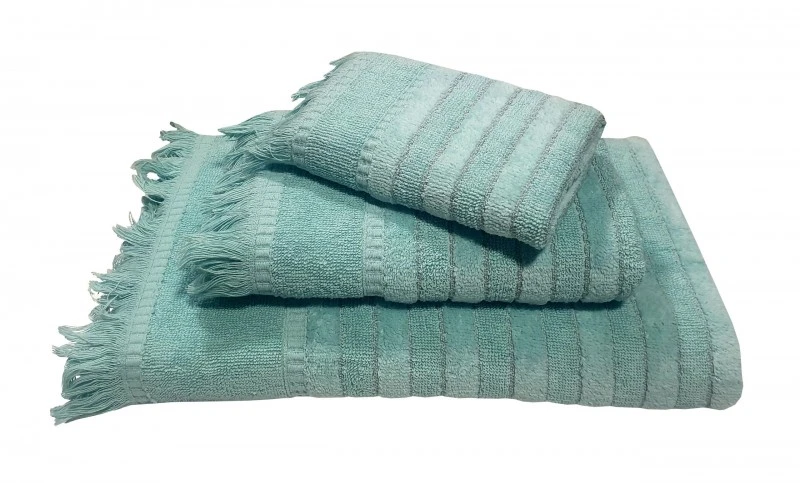 Πετσέτες σετ 3τμχ 100% βαμβακερές πεννιέ ζακάρ 550gr/m2 στο χρώμα της μέντας με κρόσια στο τελείωμα από το 24home.gr. Το σετ περιλαμβάνει: 1 πετσέτα 30x50εκ., 1 πετσέτα 50x90εκ. και 1 πετσέτα 70x140εκ.