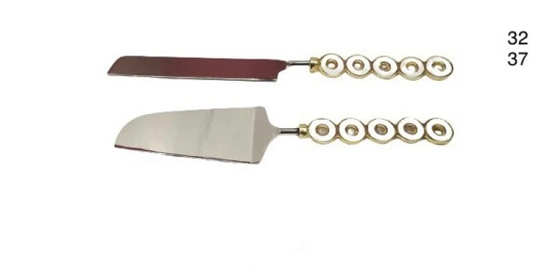 Σετ σερβιρίσματος γλυκού σπάτουλα και μαχαίρι ανοξείδωτο σε ασημί χρώμα με χρυσές και λευκές λεπτομέρειες από την Capolavoro - Διαστάσεις: 37εκ., 32εκ.