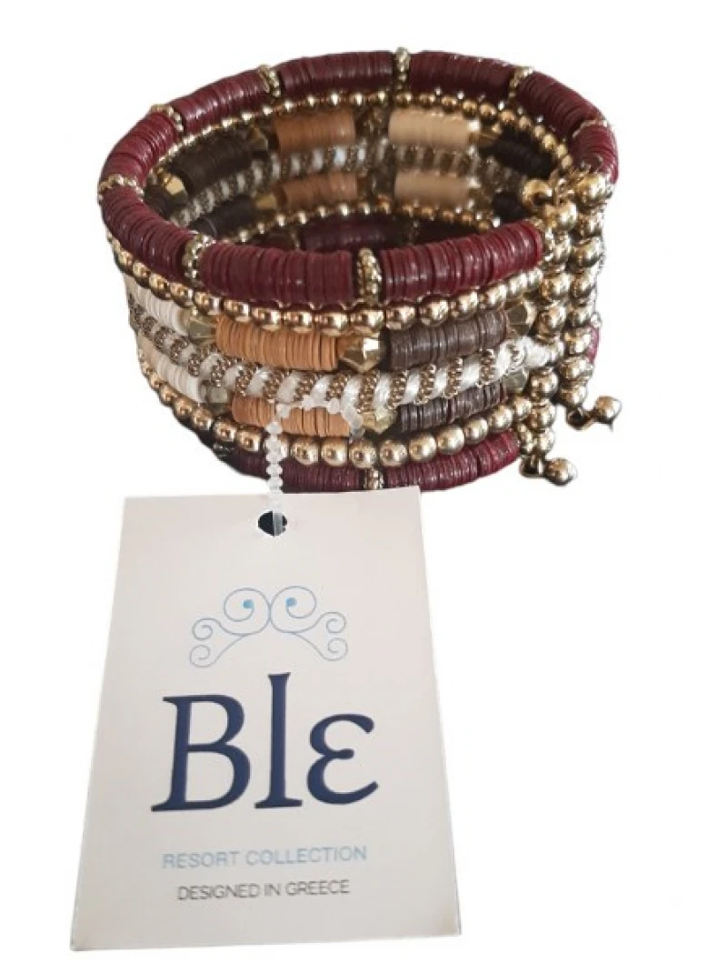 Βραχιόλι ανοιγόμενο με χάντρες σε γήινες αποχρώσεις και μπορντώ-χρυσές λεπτομέρειες από την ble.