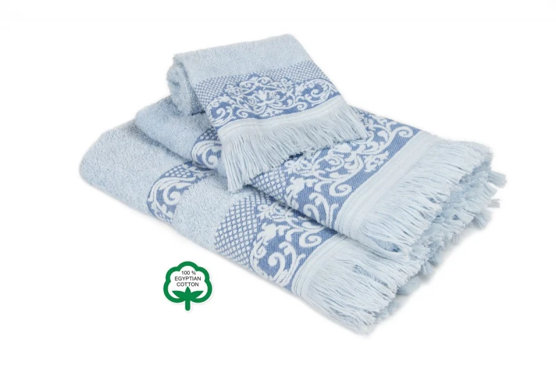 Πετσέτες μπάνιου ζακάρ με κρόσσι σετ 3 τεμαχίων από απαλό Αιγυπτιακό βαμβάκι 100% βάρους 500 gsm,πλήρως απορροφητικές. Το σετ περιλαμβάνει: πετσέτα 30x50εκ. χεριών, πετσέτα 50x90εκ. προσώπου και πετσέτα 70x140εκ. σώματος, υφασμένη απο επιλεγμένα νήματα κορυφαίας ποιότητας.