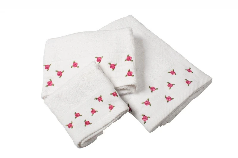 Σετ πετσέτες 3 τεμαχίων με κεντημένο σχέδιο ανθάκι που περιέχει : 1 τεμ. πετσέτα χειρός διαστάσεων 30x50εκ., 1 τεμ. πετσέτα προσώπου διαστάσεων 50x90εκ. και 1 τεμ. πετσέτα μπάνιου διαστάσεων 70x140εκ. Κατασκευασμένη από 100% οικολογικό βαμβάκι 450 gsm.
