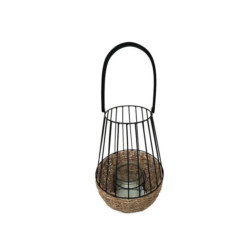Φανάρι μεταλλικό-ψάθινο σε μαύρο χρώμα από την ESPIEL - Διαστάσεις: Δ19x26εκ.