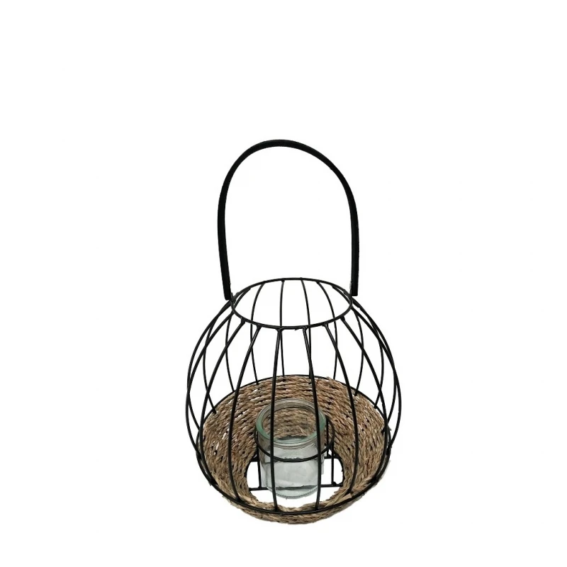 Φανάρι μεταλλικό-ψάθινο σε μαύρο χρώμα από την ESPIEL - Διαστάσεις: 20x19εκ.