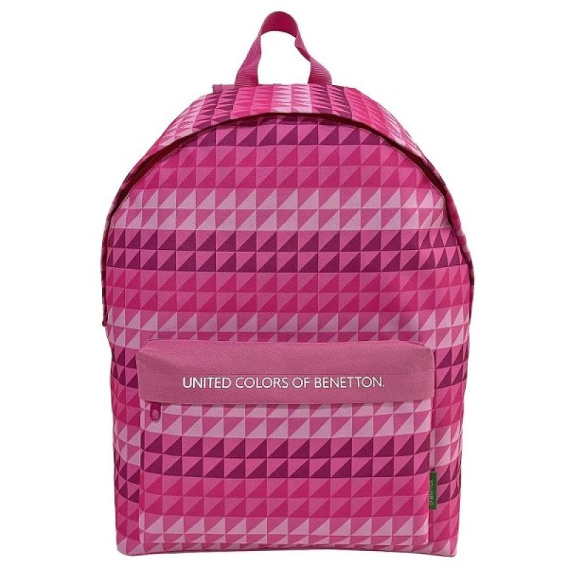 Τσάντα με ανατομική πλάτη και μπροστινή τσέπη σε ροζ χρώμα με σχέδια τρίγωνα από την benetton - Διαστάσεις: 30x17x41εκ.
