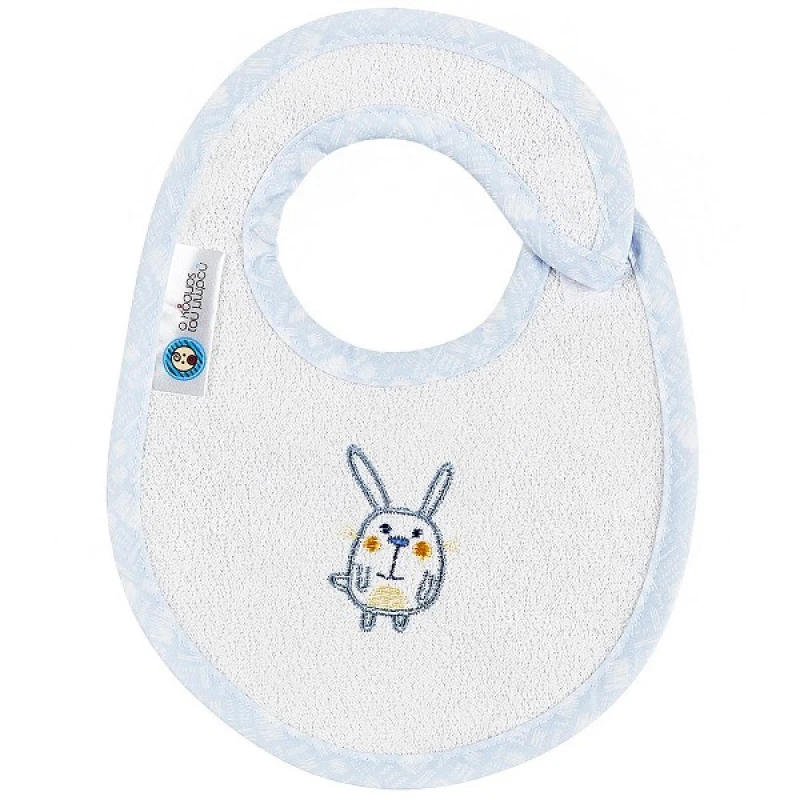 Σαλιάρα μεσαία από 80% βαμβάκι και 20% πολυεστέρα (επιφάνεια πετσέτας από 100% βαμβάκι), πλαστικοποιημένη με πολυβινυλοχλωρίδιο (PVC) χωρίς φθαλικές ενώσεις ελληνικής κατασκευής, με σιέλ χρώμα από την εταιρεία Ο Κόσμος του Μωρού.