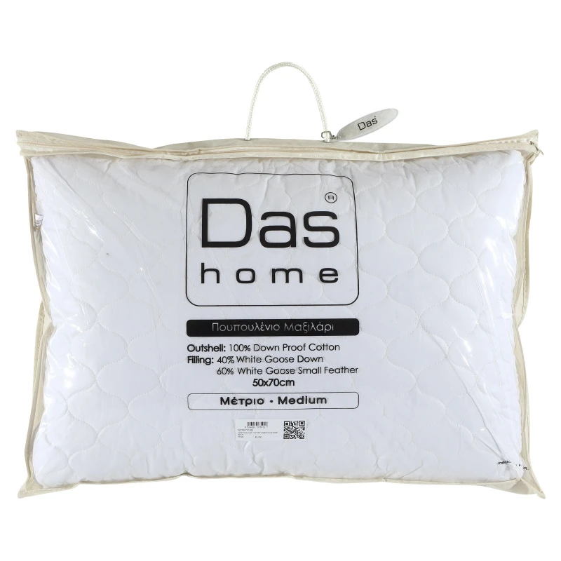 Μαξιλάρι μέτριας σκληρότητας 50x70cm. Το κάλυμμα του είναι από υποαλλεργικό βαμβακερό ύφασμα ειδικά επεξεργασμένο για την συγκράτηση του υλικού γεμίσματος, ενώ το εσωτερικό του αποτελείται από 40% πούπουλο νεοσσού χήνας και 60% φτεράκι. Ιδιαίτερα απαλό και ανθεκτικό στη χρήση. Das home...makes your house a home!
