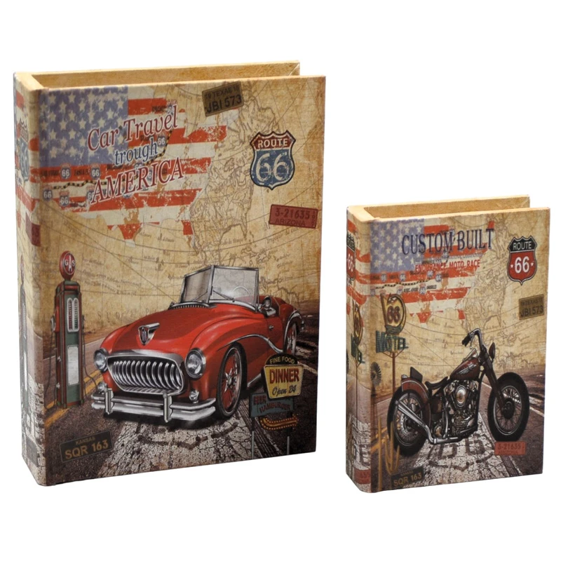 Κουτί βιβλίο αποθήκευσης σετ 2τμχ ξύλινο σε καφέ χρώμα με αυτοκίνητο και μηχανή από την Royal Art Collection - Διαστάσεις: 17,5x5,2x23εκ.-11,2x3,8x16εκ.