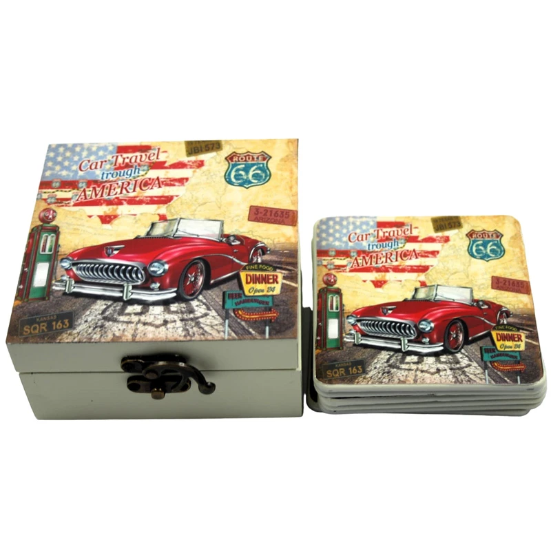 Σετ 6τμχ σουβέρ ξύλινα σε κουτί με σχέδιο αυτοκίνητο σε μπεζ χρώμα από την Royal Art Collection.