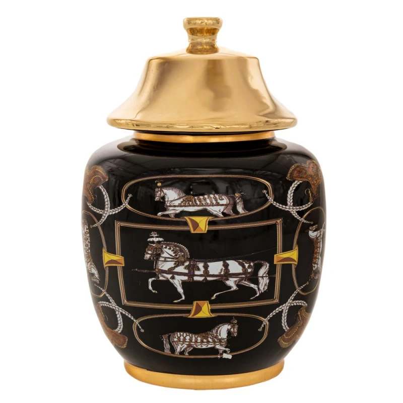 Διακοσμητικό βάζο κεραμικό σε μαύρο χρώμα με σχέδια και χρυσό καπάκι από την iliadis - Διαστάσεις: Φ18x26,5εκ.