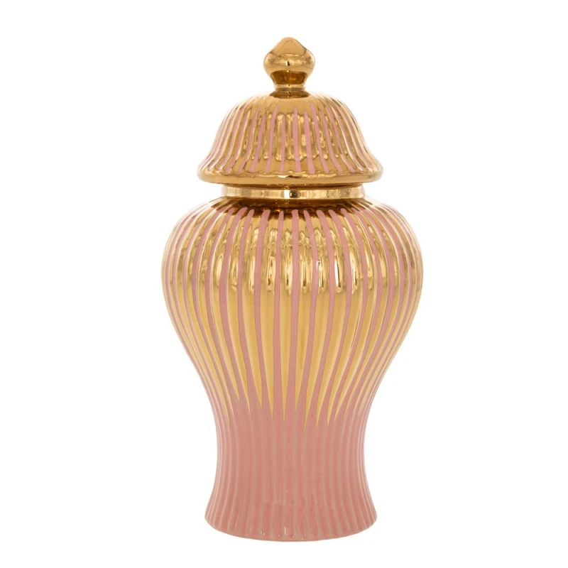 Διακοσμητικό βάζο κεραμικό με καπάκι σε σομόν χρώμα και χρυσές ρίγες από την iliadis - Διαστάσεις: Φ15,5x29,5εκ.