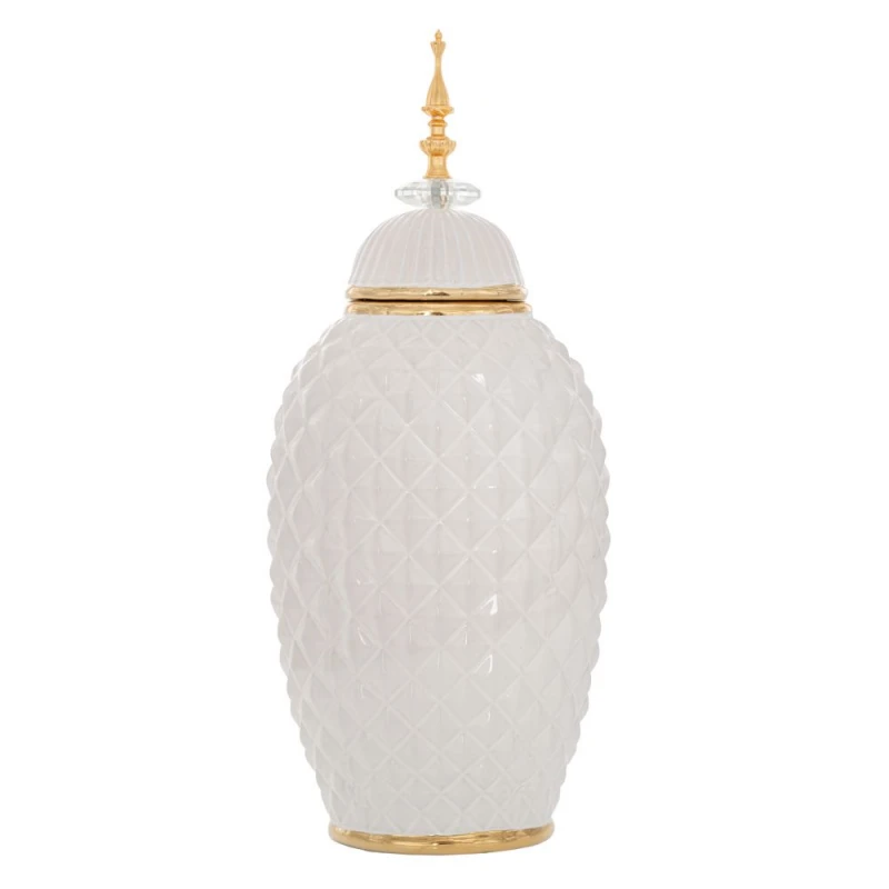 Διακοσμητικό βάζο κεραμικό με καπάκι σε λευκό χρώμα και χρυσές λεπτομέρειες από την iliadis - Διαστάσεις: 20x15,5x47,5εκ.