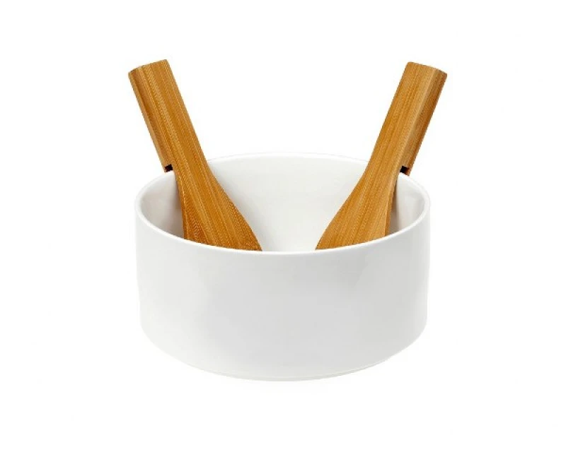 Σαλατιέρα πορσελάνης σε λευκό χρώμα με σετ κουτάλες σερβιρίσματος από την Cryspo Trio - Διαστάσεις: 23x8,5εκ.
