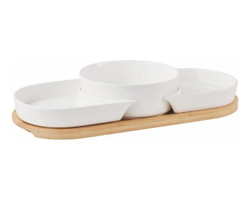 Ορντερβιέρα - σετ σερβιρίσματος πορσελάνης σε λευκό χρώμα με ξύλινη βάση bamboo natural από την Cryspo Trio - Διαστάσεις: 40x17,5x7εκ.