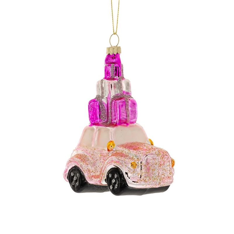 Χριστουγεννιάτικο στολίδι κρεμαστό αυτοκίνητο γυάλινο σε ροζ χρώμα με δώρα από την iliadis - Διαστάσεις: 9,5x5x11εκ. - Η ελάχιστη ποσότητα αγοράς για αυτό το προϊόν είναι 6τμχ.