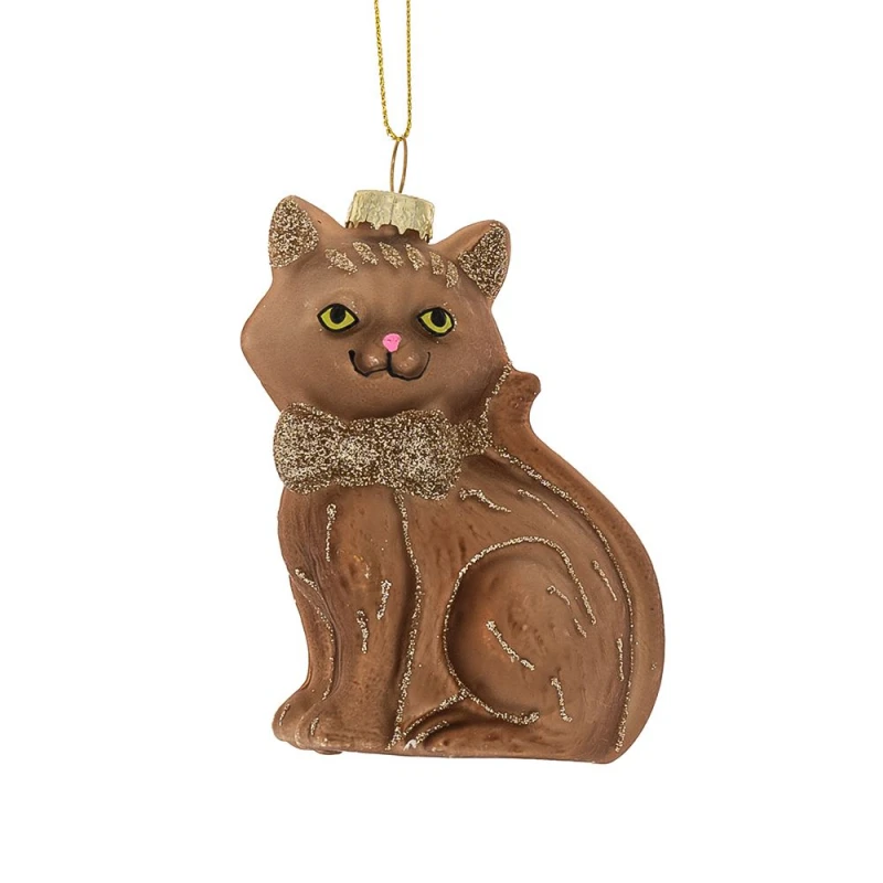 Χριστουγεννιάτικο στολίδι κρεμαστή γατούλα γυάλινη σε καφέ χρώμα από την iliadis - Διαστάσεις: 6,5x5x9,5εκ. - Η ελάχιστη ποσότητα αγοράς για αυτό το προϊόν είναι 6τμχ.