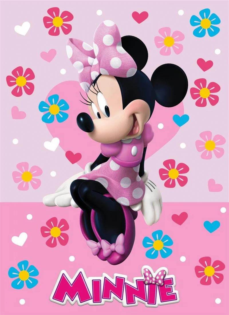 Κουβέρτα βελουτέ Disney για μονό κρεβάτι, διαστάσεων 160x220εκ., απαλή και ζεστή με βελούδινη υφή και ανεξίτηλα χρώματα. Κατασκευασμένη από ύφασμα 100% polyester, με σχέδιο ψηφιακής εκτύπωσης που απεικονίζει την αγαπημένη και διαχρονική ηρωίδα της Disney, Minnie Mouse. Συσκευασία βαλιτσάκι PVC bag με φερμουάρ και χερούλι.