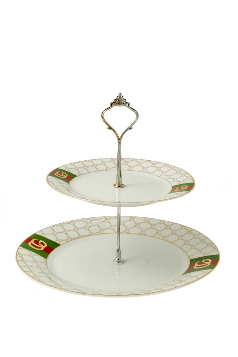 Ορντερβιέρα 2 όροφη πορσελάνης σε πράσινο - χρυσό χρώμα από την Zen Collection - Διαστάσεις: 26,7εκ.-19εκ.