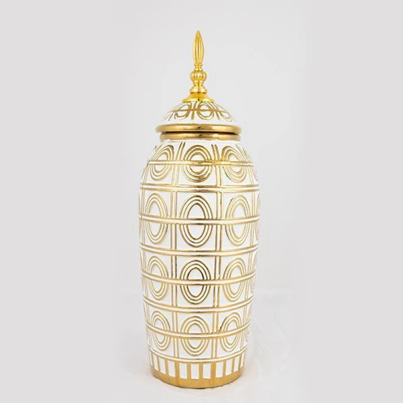 Βάζο με καπάκι κεραμικό σε λευκό-χρυσό χρώμα από την ESTHETI - Διαστάσεις: 15x15x42,5εκ.