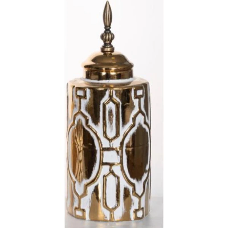 Βάζο με καπάκι κεραμικό σε λευκό-χρυσό χρώμα από την ESTHETI - Διαστάσεις: 13x13x33εκ.