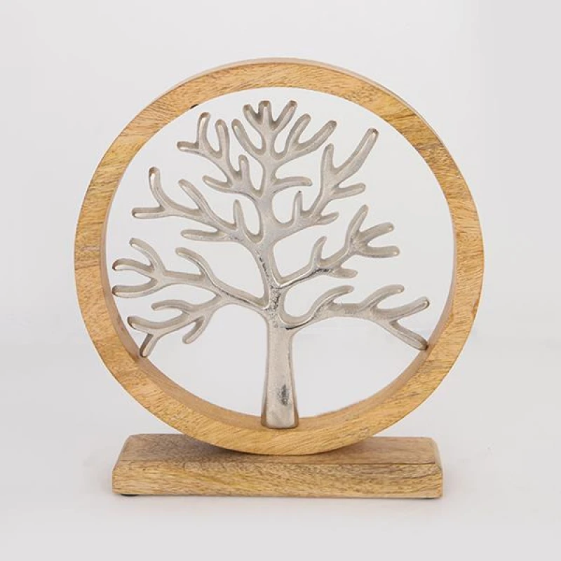 Επιτραπέζιο διακοσμητικό με μεταλλικό δέντρο σε ασημί χρώμα μέσα σε ξύλινο δακτύλιο σε φυσικό χρώμα από την ESTHETI - Διαστάσεις: 28x5x31εκ.