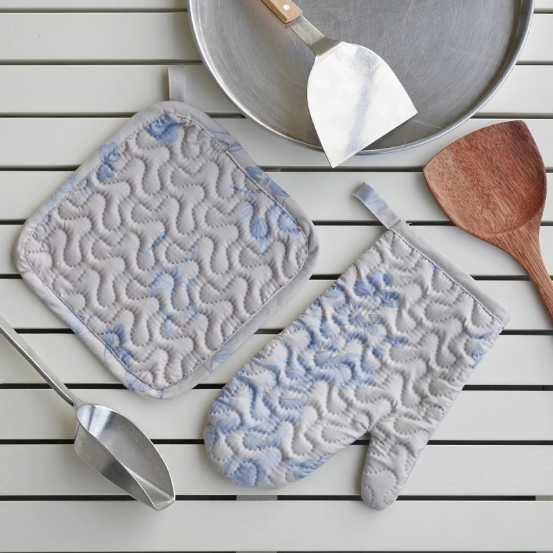 Σετ κουζίνας Πιάστρα & Γάντι Amelia, εμπριμέ, σε γκρι μπλε αποχρώσεις. Δίνει στυλ & προστατεύει από τα καψίματα κατά το μαγείρεμα.