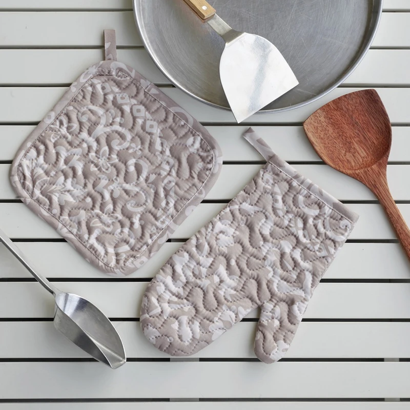 Σετ κουζίνας Πιάστρα & Γάντι Dakota, εμπριμέ, σε εκρού μπεζ αποχρώσεις. Δίνει στυλ & προστατεύει από τα καψίματα κατά το μαγείρεμα. Το σετ περιλαμβάνει, 1 πιάστρα 20x20εκ. και 1 γάντι 18x28εκ.