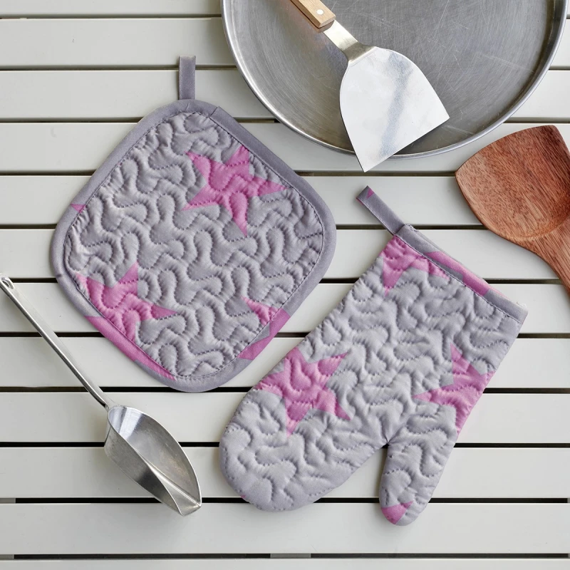 Σετ κουζίνας Πιάστρα & Γάντι Star Girl, εμπριμέ, σε γκρι φούξια αποχρώσεις. Δίνει στυλ & προστατεύει από τα καψίματα κατά το μαγείρεμα. Το σετ περιλαμβάνει, 1 πιάστρα 20x20εκ. και 1 γάντι 18x28εκ.