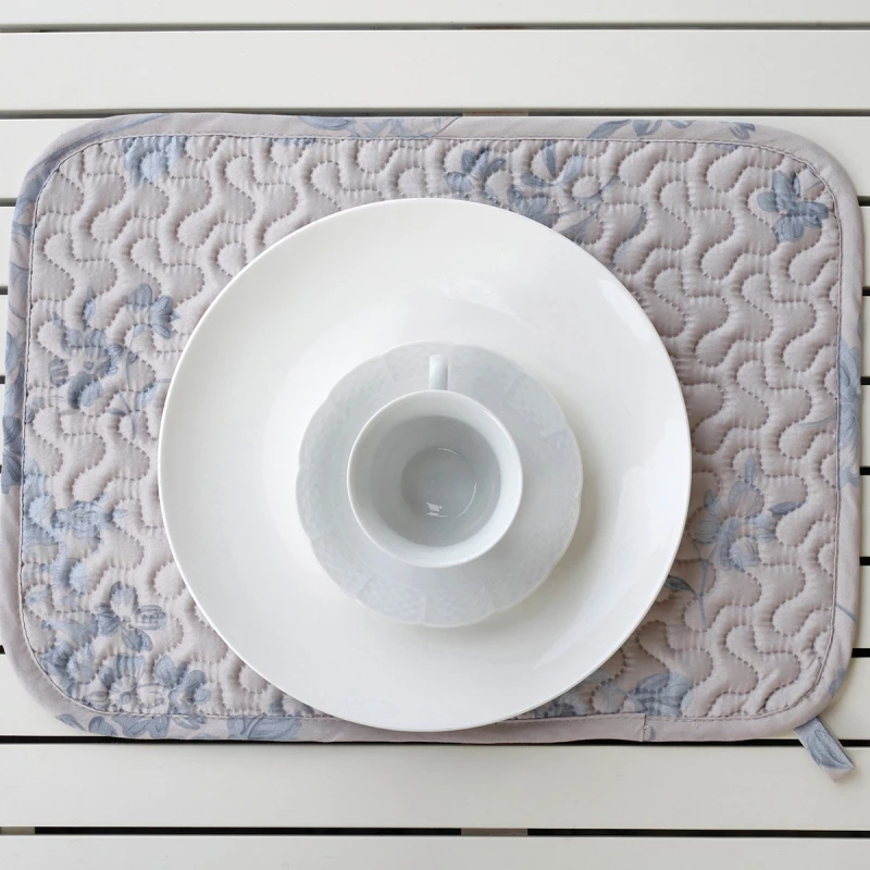 Σουπλά Amelia εμπριμέ, σε γκρι μπλε αποχρώσεις. Κατασκευασμένο από ύφασμα 100% Microfiber, δίνει στυλ σε κάθε τραπέζι και προστατεύει. - Η ελάχιστη ποσότητα αγοράς για αυτό το προϊόν είναι 2τμχ.