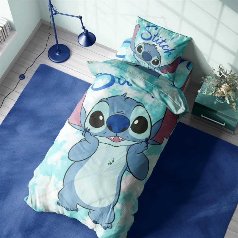 Παιδικό σετ σεντόνια 4 τεμαχίων που περιέχει: 2τεμ. flat σεντόνια, διαστάσεων 160x240εκ. και 2τεμ. μαξιλαροθήκες διαστάσεων, 50x70εκ. Κατασκευασμένο από 100% βαμβακερό ύφασμα, με σχέδιο ψηφιακής εκτύπωσης που απεικονίζει τον Stitch, τον αγαπημένο ήρωα της σειράς της Disney, Lilo & Stitch, 144 κλωστών. Συσκευασία δίπτυχο PVC bag.