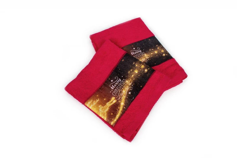 Σετ πετσέτες Χριστουγεννιάτικες 2 τεμ. σε χρώμα κόκκινο, με ανεξίτηλα χρώματα και σχέδιο με φάσα ψηφιακής εκτύπωσης που απεικονίζει γιορτινούς τάρανδους και μήνυμα για καλά Χριστούγεννα, ιδανικό για δώρο που περιέχει: 1 τεμ. πετσέτα χειρός, διαστάσεων 30X50 και 1 τεμ. πετσέτα προσώπου, διαστάσεων 50X90. Οι πετσέτες είναι κατασκευασμένες από 100% βαμβάκι έξτρα απαλό και απορροφητικό και είναι ελεγμένες για επιβλαβείς ουσίες με το αναγνωρισμένο παγκοσμίως πιστοποιητικό, OEKO TEX Standard 100. Συσκευασία δώρου με γιορτινή κορδέλα.