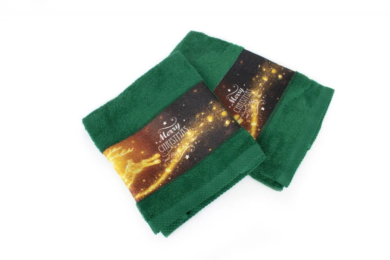 Σετ πετσέτες Χριστουγεννιάτικες 2 τεμ. σε χρώμα πράσινο, με ανεξίτηλα χρώματα και σχέδιο με φάσα ψηφιακής εκτύπωσης που απεικονίζει γιορτινούς τάρανδους και μήνυμα για καλά Χριστούγεννα, ιδανικό για δώρο που περιέχει: 1 τεμ. πετσέτα χειρός, διαστάσεων 30X50 και 1 τεμ. πετσέτα προσώπου, διαστάσεων 50X90. Οι πετσέτες είναι κατασκευασμένες από 100% βαμβάκι έξτρα απαλό και απορροφητικό και είναι ελεγμένες για επιβλαβείς ουσίες με το αναγνωρισμένο παγκοσμίως πιστοποιητικό, OEKO TEX Standard 100. Συσκευασία δώρου με γιορτινή κορδέλα.