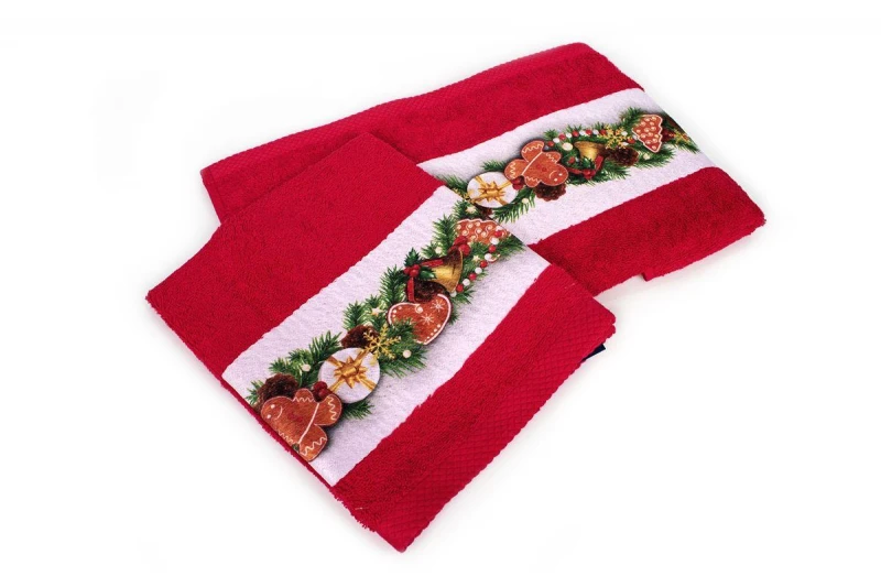 Σετ πετσέτες Χριστουγεννιάτικες 2 τεμ. σε χρώμα κόκκινο, με ανεξίτηλα χρώματα και σχέδιο με φάσα ψηφιακής εκτύπωσης που απεικονίζει γιορτινά στολίδια, ιδανικό για δώρο που περιέχει: 1 τεμ. πετσέτα χειρός, διαστάσεων 30X50 και 1 τεμ. πετσέτα προσώπου, διαστάσεων 50X90. Οι πετσέτες είναι κατασκευασμένες από 100% βαμβάκι έξτρα απαλό και απορροφητικό και είναι ελεγμένες για επιβλαβείς ουσίες με το αναγνωρισμένο παγκοσμίως πιστοποιητικό, OEKO Standard 100. Συσκευασία δώρου με γιορτινή κορδέλα.
