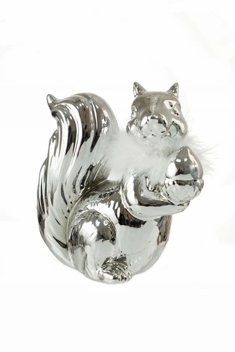 Διακοσμητικός επιτραπέζιος σκίουρος κεραμικός σε ασημί χρώμα με λευκό πούπουλο από την Zen Collection - Διαστάσεις: 16,5x16x8εκ.