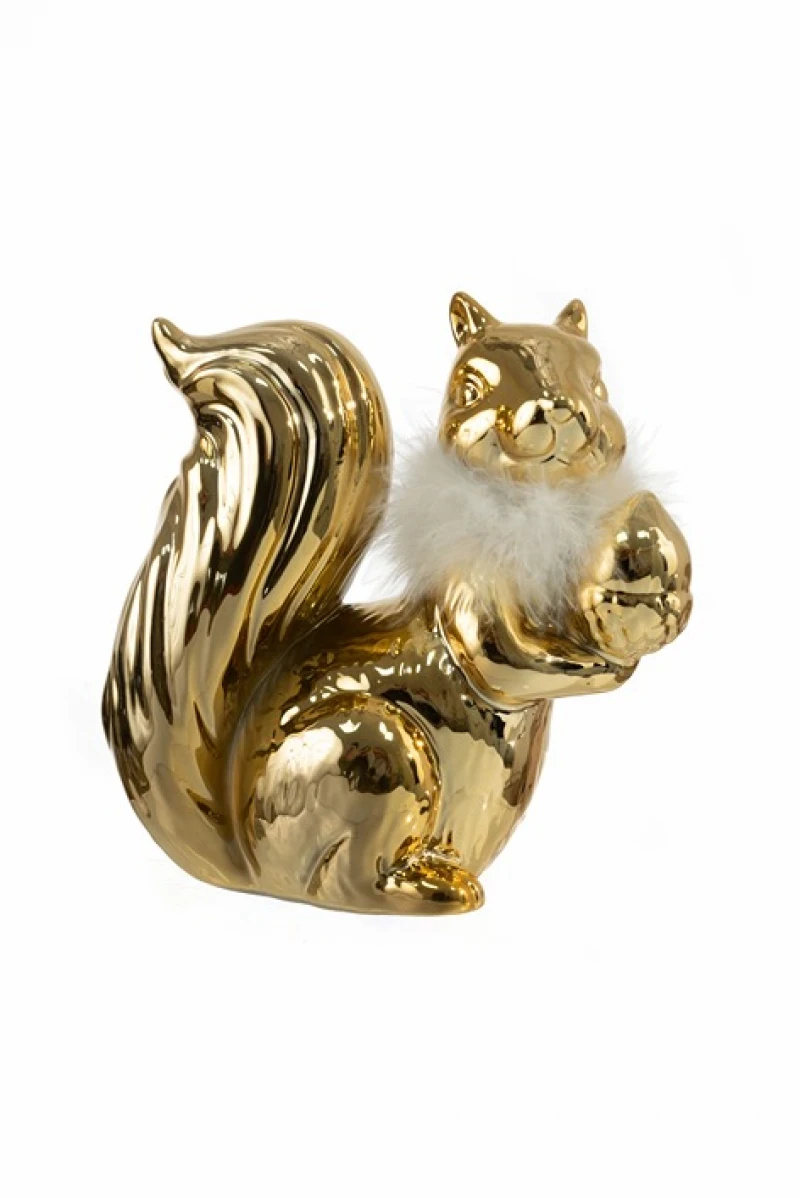 Διακοσμητικός επιτραπέζιος σκίουρος κεραμικός σε χρυσό χρώμα με λευκό πούπουλο από την Zen Collection - Διαστάσεις: 16,5x16x8εκ.