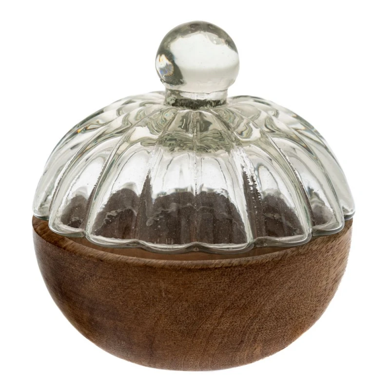 Διακοσμητικό μπώλ ξύλινο καφέ με καπάκι γυάλινο διάφανο από την iliadis - Διαστάσεις: 12x12x12εκ.