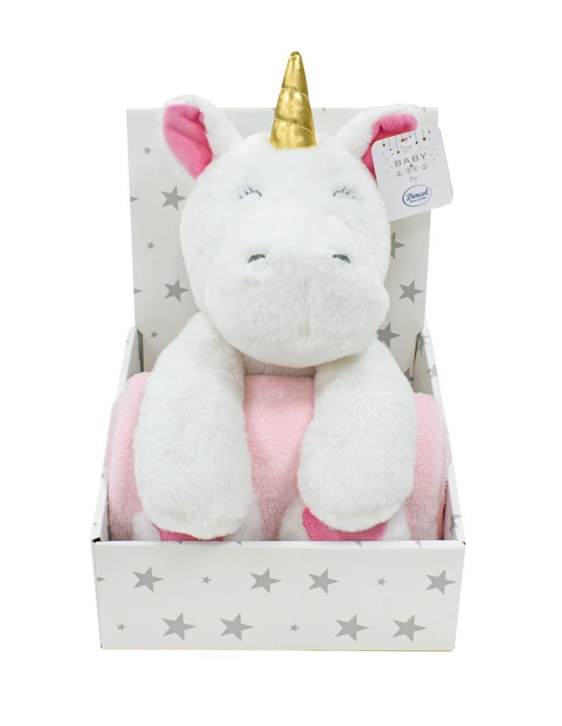 Σετ Κουβέρτα Fleece Αγκαλιάς-Λίκνου 75x90εκ. Με Λούτρινο Ζωάκι 25εκ. Unicorn 02 White-Pink Dimcol