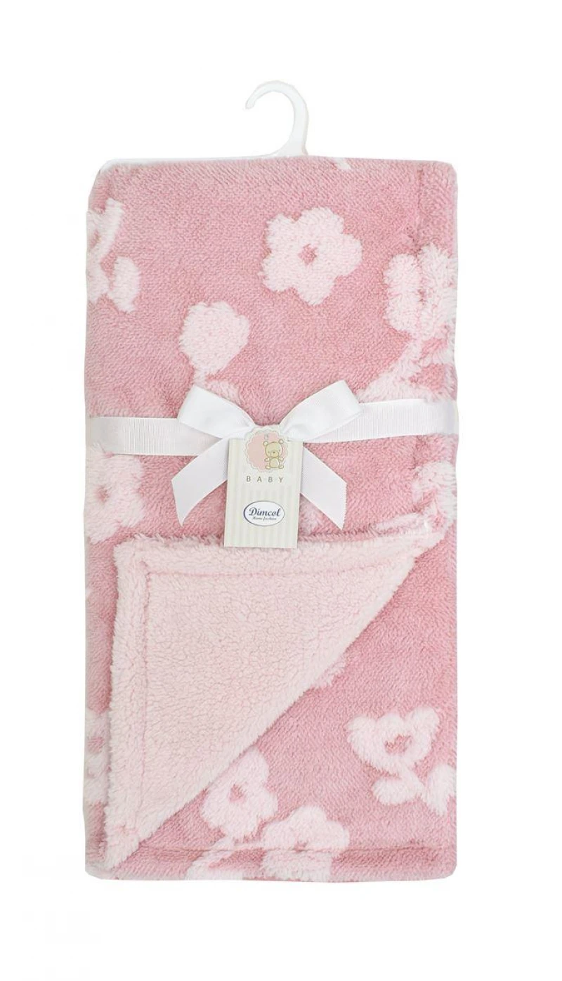 Κουβερτούλα διπλής όψεως με Sherpa 260 gr/m2 με Jacquard σχέδιο με λουλουδάκια, κατιονικής επεξεργασίας κάτι που καθιστά τα χρώματα της ανεξίτηλα, στην πάνω πλευρά και μονόχρωμη Sherpa 200 gr/m2 στην κάτω πλευρά, διαστάσεων 75x100εκ. Οι δύο στρώσεις την καθιστούν πολύ ζεστή και ιδανική για την αγκαλιά, την κούνια και την βόλτα του μωρού σας, ακόμα και τους πιο κρύους μήνες του χειμώνα. Συσκευασία κορδελίτσα με καρτελάκι και κρεμάστρα.