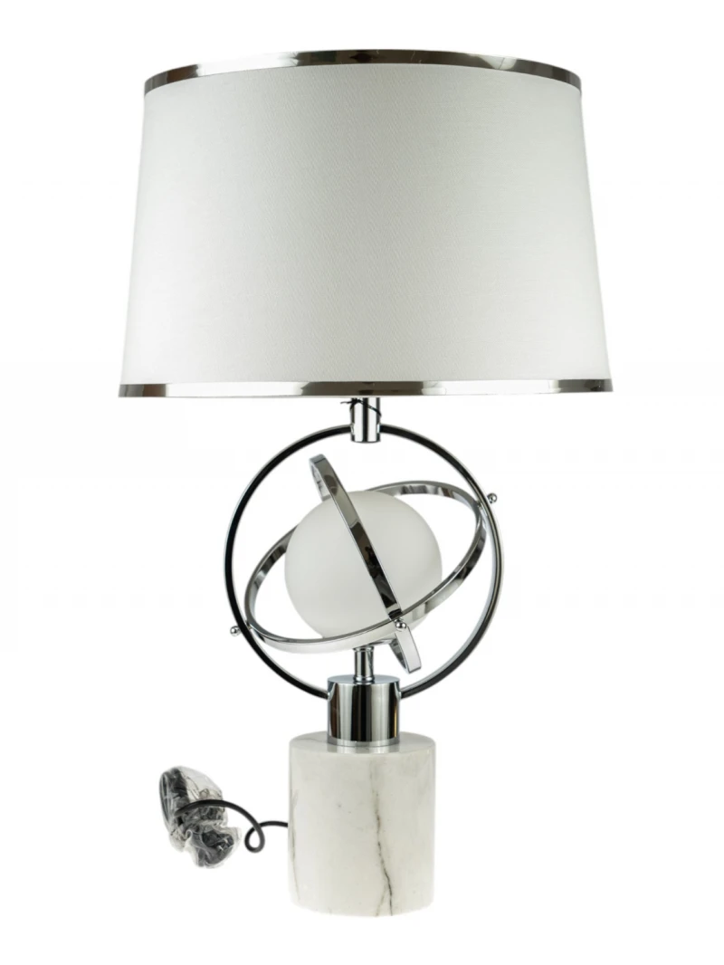 Επιτραπέζιο φωτιστικό ασημί με λευκό καπέλο, ασημί ρίγες και μαρμάρινη λευκή βάση από την Zen Collection - Διαστάσεις: 40x70εκ.