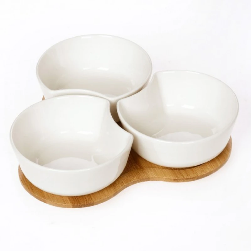 Ορντερβιέρα-dip 3 θέσεων πορσελάνης σε λευκό χρώμα με βάση bamboo σε natural χρώμα της σειράς Lotos από την Cryspo Trio - Διαστάσεις βάσης: 23x21εκ., Διαστάσεις μπωλ: 10x11εκ.