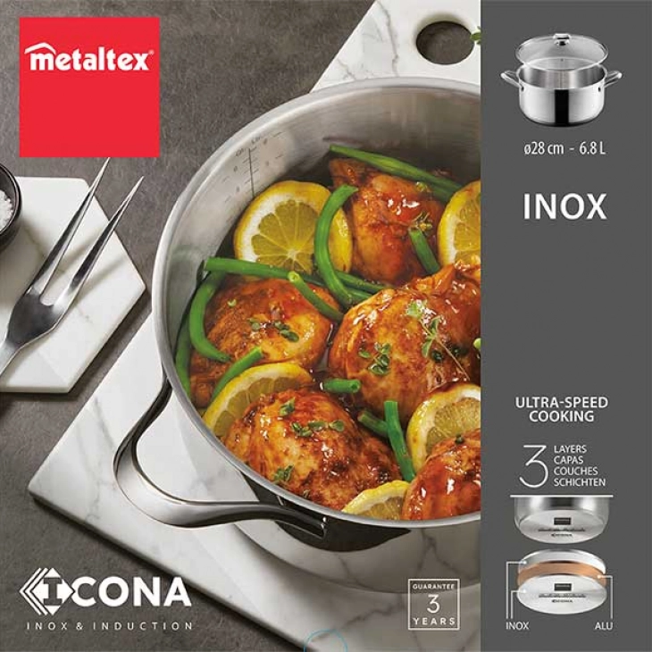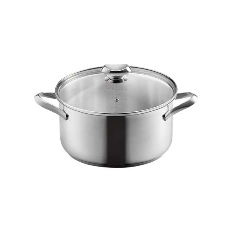 Κατσαρόλα ανοξείδωτη με γυάλινο καπάκι, με διαβαθμίσεις εσωτερικά και μπορεί να τοποθετηθεί στον φούρνο (χωρίς το καπάκι) από την Metaltex - Διαστάσεις: 24εκ., Χωρηστικότητας: 5ltr.