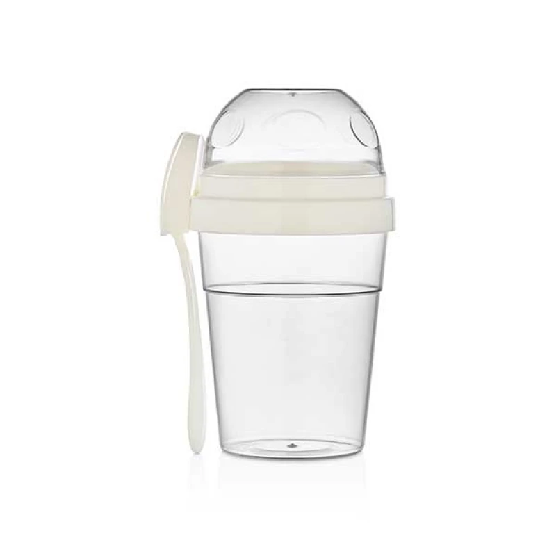 Φορητό δοχείο-μπωλ σαλάτας, γιαουρτιού και φρούτων με κουτάλι όπου διαχωρίζεται το δοχείο από το καπάκι σε ιβουάρ χρώμα από την Veltihome Allset - Χωρητικότητα μπωλ: 600ml, Χωρητικότητα καπακιού: 200ml.