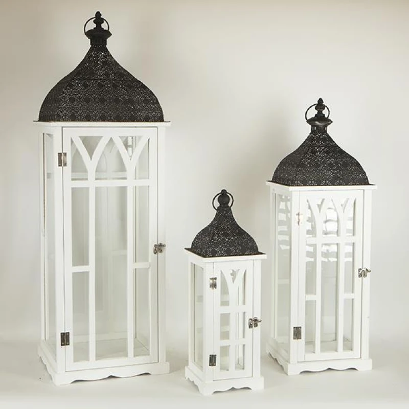 Φανάρι σετ 3τμχ ξύλινο σε λευκό χρώμα με μεταλλική μαύρη οροφή από την ESTHETI - Διαστάσεις: 31x31x97εκ.-24x24x72εκ.-17x17x49εκ.