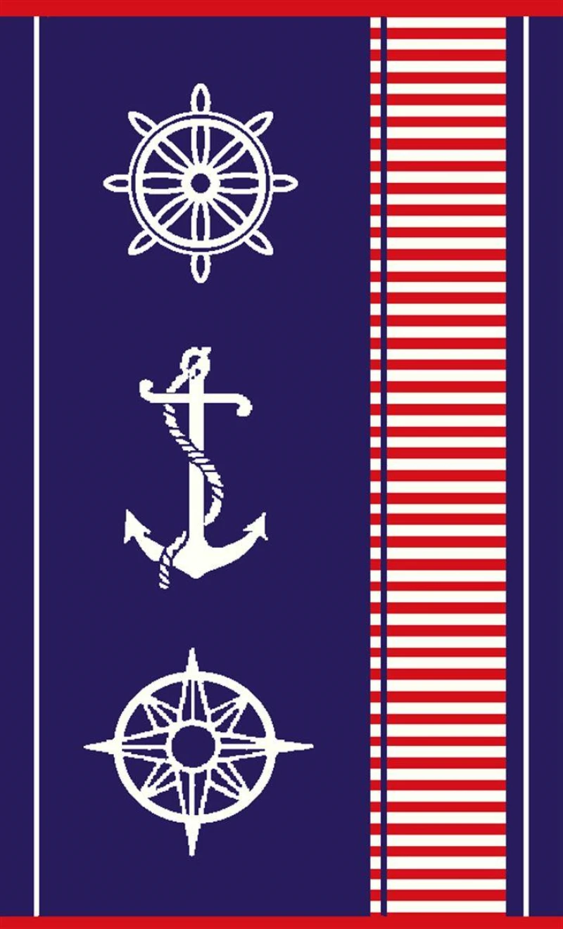 Βελουτέ πετσέτα θαλάσσης, διαστάσεων 87x165εκ., με ζακάρ σχέδιο διπλής όψεως που απεικονίζει τιμόνι, άγκυρα και πυξίδα, σε μπλε χρώμα με κόκκινες λεπτομέρειες. Κατασκευασμένη από 100% αιγυπτιακό βαμβάκι, υψηλής απαλότητας και απορροφητικότας, βάρους 420 gr/m². Συσκευασία Polybag.