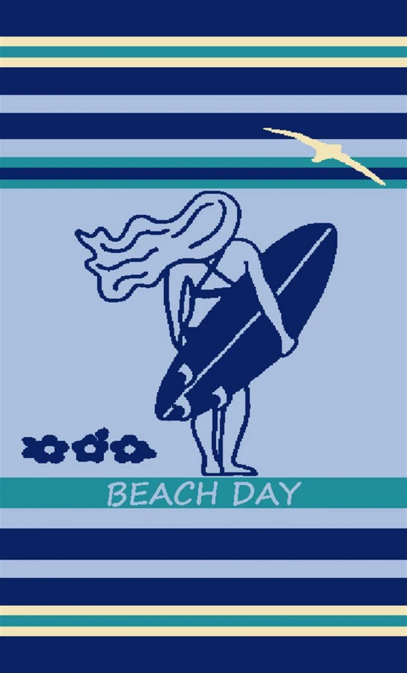 Βελουτέ πετσέτα θαλάσσης, διαστάσεων 87x165εκ., με ζακάρ σχέδιο διπλής όψεως που απεικονίζει μία σέρφερ, σε σιελ χρώμα με μπλε λεπτομέρειες. Κατασκευασμένη από 100% αιγυπτιακό βαμβάκι, υψηλής απαλότητας και απορροφητικότας, βάρους 420 gr/m². Συσκευασία Polybag.