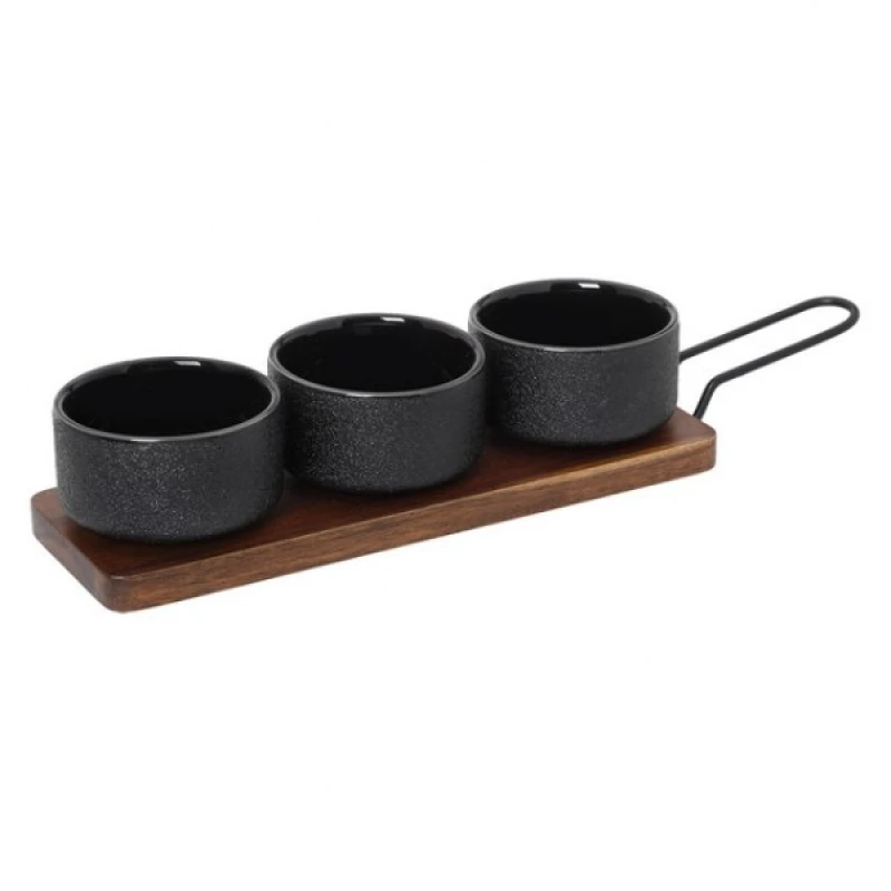 Ένα σετ με ξύλινη βάση από ακακία και μαύρο χερούλι, σχεδιασμένο για να φιλοξενεί τρία μπωλάκια - ντιπ σερβιρίσματος Black Crystal Glaze on Stoneware από την Cryspo Trio - Διαστάσεις βάσης: 28x10x6εκ.