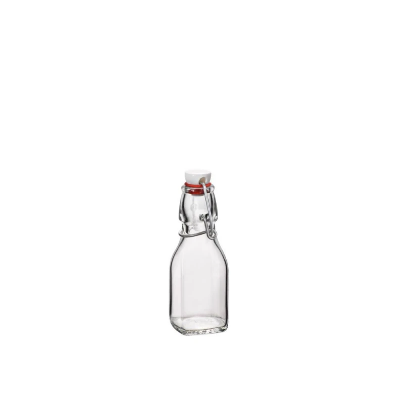Μπουκαλάκι μικρό γυάλινο και διάφανο με κλιπ της σειράς Swing από την Bormioli Rocco - Χωρητικότητα: 125ml. - Διαστάσεις: 5,15x13,4εκ.- Η ελάχιστη ποσότητα αγοράς για αυτό το προϊόν είναι 4τμχ.