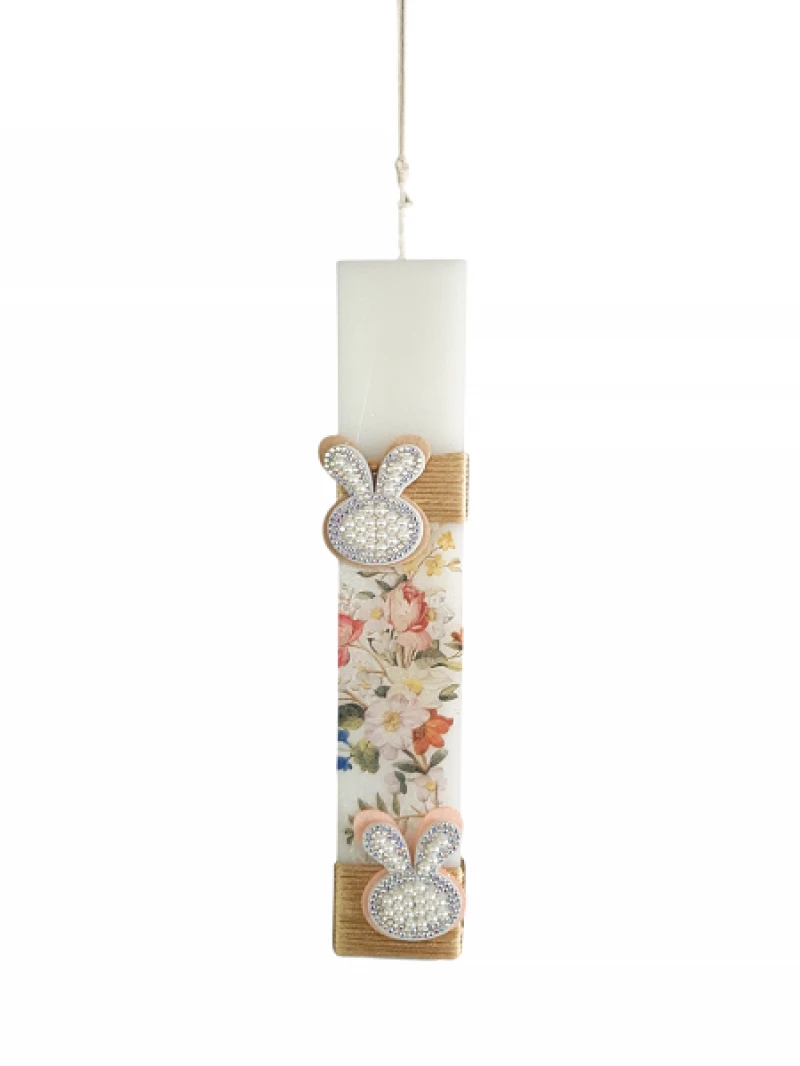 Λαμπάδα αρωματική χειροποίητη πλακέ σε λευκό χρώμα με την τεχνική του decoupage με σχέδιο λουλούδια και λαγουδάκια - Διαστάσεις: 2,7x1,2x25εκ.