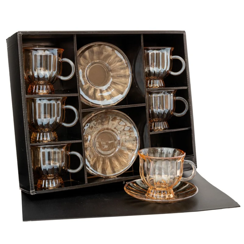 Σετ 6τμχ φλυτζάνια καφέ γυάλινα σε μελί χρώμα (κουτί) από την iliadis - Διαστάσεις φλυτζανιού: 8x8εκ., Διαστάσεις πιατάκι: 13εκ.